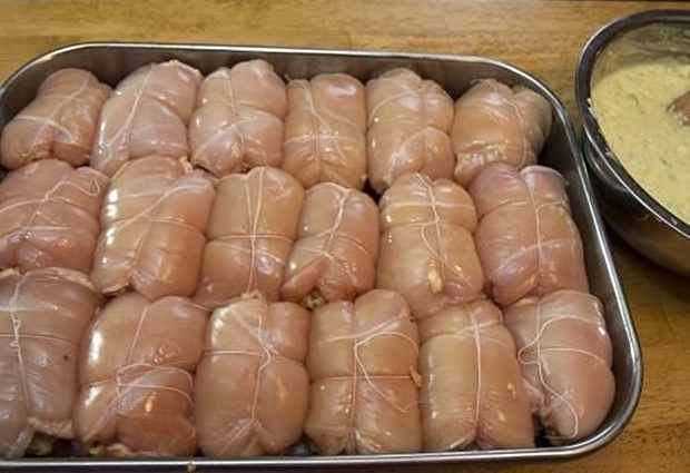 Umotajte piletinu kao koverat i svaki koverat uvežite koncem.